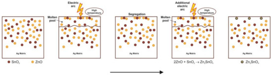 To explain the results obtained, we proposed the following reaction mechanism, schematically presented in Figure 14. In the initial stage, a superficial layer of the material is melted due to arc energy, forming a molten pool where the SnO2 and ZnO are segregated on the surface due to their lower density and poor wettability with liquid Ag. In the intermediate stage, the segregation process continues, promoting the contact between the particles of SnO2 and ZnO. In the last stage, the reaction between SnO2 and ZnO to form Zn2SnO4 takes place due to the increase in temperature caused by the effect of electric arcs.