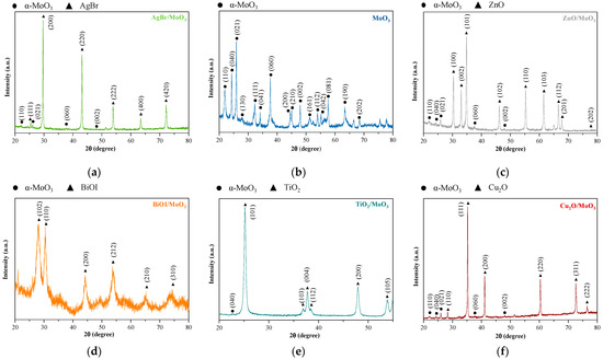 X-ray diffractograms of the as-prepared composites: (a) AgBr/MoO3, (b) α-MoO3, (c) ZnO/MoO3, (d) BiOI/MoO3, (e) TiO2/MoO3, and (f) Cu2O/MoO3 composites’ XRD patterns.