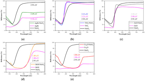 DRS spectra and their respective band gap values: (a) AgBr/MoO3, (b) TiO2/MoO3, (c) ZnO/MoO3, (d) BiOI/MoO3, and (e) Cu2O/MoO3.