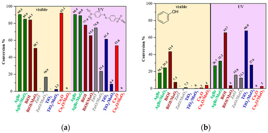 The photocatalytic efficiency values are presented in Figure 4. Pristine photocatalysts reached higher activity in the degradation of methyl orange compared to phenol, except in the case of TiO2 (Figure 4). Higher photocatalytic conversion for MO could be achieved because its degradation mechanism consists of both radicals (hydroxyl and superoxide radicals) and photogenerated holes. Anatase TiO2 and ZnO were active only in UV due to their optical properties. Cu2O presented outstanding activity in the degradation of MO in visible light (92% conversion), while in UV, adsorption was predominant (Figure S2). Cu2O was not active in the photodegradation or adsorption of phenol. The literature also presents that Cu2O is both a visible-light-active photocatalyst and an adsorbent for MO [24,25]. BiOI and AgBr, independently from the light source, presented stable activity in MO decomposition. However, phenol degradation reached higher conversion under UV illumination (Figure 4).