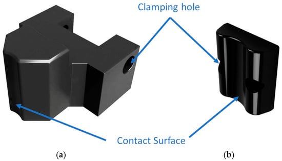 This design aims to create jaws with a suitable shape that can ensure proper clamping of shafts. The shape of the clamping jaws (Figure 1) is designed in CAD software Autodesk Inventor 2023 (Autodesk, Inc., San Francisco, CA, USA). Two types of prototypes were designed. The first type is multipurpose jaws (Figure 1a), which can clamp both the outer and inner diameters. The second type of jaws is designed as a separate outer clamping element (Figure 1b). When designing the outer jaws, the volume was significantly reduced to minimize the deformation zones. This design offers the advantage of smaller dimensions and higher stiffness. However, the disadvantage is that it can only clamp the component on its outer surfaces.