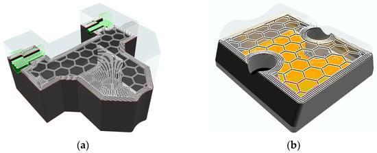 The density of the infill and the shape of the material’s infill patterns in the form of hexagons, triangles, and rectangles affect the resulting strength of the material. Increasing the infill by 30% to 50% and applying the hexagonal infill will increase the energy absorption values [40]. The production of multipurpose jaws (Figure 3a) involved the use of an internal hexagonal structure with a density of 27%. This percentage was calculated and recommended by the software of the additive device. The height of the bottom and top layers was set to 0.4 mm, and the wall thickness to 2.4 mm. The entire additive manufacturing process took 22 h. To produce the outer jaws, the internal structure was oriented perpendicular to the machined surface (Figure 3b). Smaller dimensions allowed for an increase in the internal structure of up to 55%. To increase the stiffness of the jaws, two layers of carbon fiber were added as reinforcement (depicted in orange in Figure 3b), with layer thicknesses of 0.5 mm and 1.25 mm. The volume of onyx for one piece was 7.49 cm3 and the carbon fiber represented 0.76 cm3. The height of the bottom and top layers was set to 1 mm, and the wall thickness to 1.6 mm. The total manufacturing time of the jaws was 4.5 h. The placement of the model in additive manufacturing depended on the shape of the jaws. The goal was to achieve the greatest possible surface contact of the model with the printing table. Another factor was the elimination of print supports.
