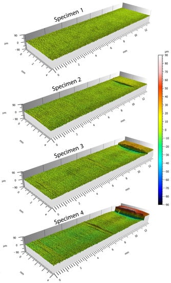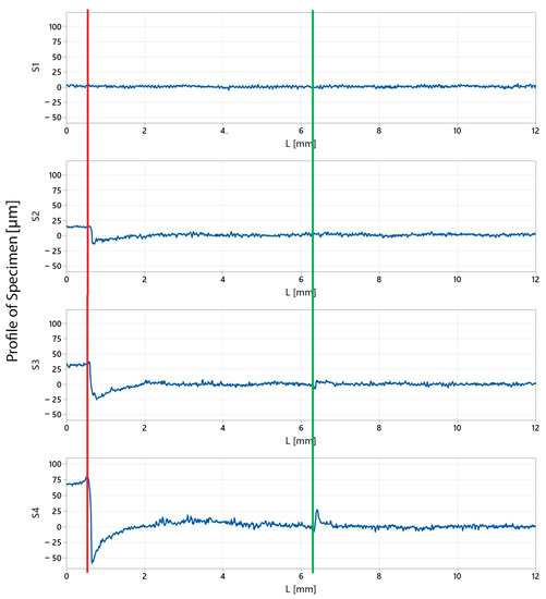 Both visual inspection and 2D profile measurements revealed deformations after clamping with metal jaws. Figure 6 displays the measurement record showing the areas that came into contact with the edge of the metal jaws. The red line indicates the contact point of the side edge of the jaw, which was also visible during visual inspection. The resulting deformation is visible in the captured profiles. The metal jaws compressed the entire surface of the workpiece due to the clamping pressure. Compression reduced the radius of specimen S2 by 15 µm. Specimen S4 experienced the greatest compression of the material, with a radius compressed by 70 µm. The metal jaw had an edge perpendicular to the workpiece axis in its middle part, causing a similar but less significant deformation. The green line in Figure 6 shows the size of the deformation, which reached values of 5 µm for specimen S3 and 25 µm for specimen S4.
