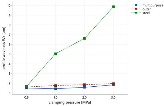 The surface waviness measurement during filtration with λc 0.8 mm revealed a significant difference in the surface of the specimens depending on the type of jaws applied (Figure 8). Standard metal jaws produced the highest values of the waviness parameter, Wz. At the lowest pressure of 0.5 Mpa, the specimen waviness was 1.68 µm, but it increased to a Wz value of 9.86 µm at a clamping pressure of 3 Mpa. In contrast, when using multipurpose composite jaws, the maximum waviness values reached only 1.84 µm. Similarly, the outer jaws produced a maximum waviness of 1.96 µm at a clamping pressure of 3 Mpa. Overall, increasing the clamping pressure resulted in higher waviness parameters. The reference material, which was not subjected to clamping pressure, had a Wz parameter of 1.64 µm. Comparing the specimens used for different types of jaws, we found that the highest difference in waviness, compared to the reference material, occurred with the application of the metal clamping jaws.