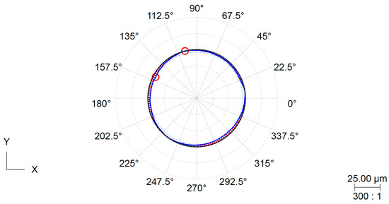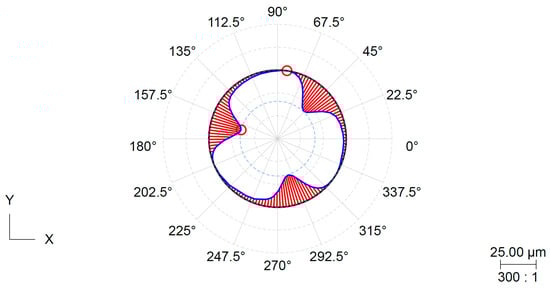 The roundness tolerances are classified under the form tolerance group. The surface being measured has filtered roughness and waviness components and is evaluated by comparing it with the ideal geometric shape. The roundness deviation is determined by the largest difference between these components. The minimum circumscribed circle (MCC) method was used, as per EN ISO 12181-1. The roundness parameter was measured for all the specimens, which had the same shape due to the applied clamping pressure. Figure 9 and Figure 10 depict that the shape character corresponds to the deformation derived from the three-jaw chuck.