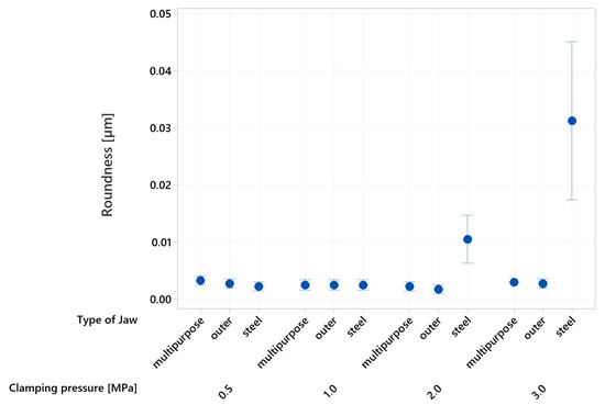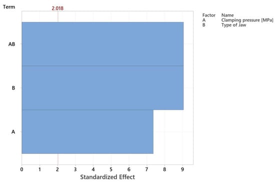To understand the impact of individual parameters on the resulting roundness of the specimens, a Pareto chart of effects (Figure 12) was constructed with an accuracy of 85.06%. Our analysis revealed that both examined factors have a significant impact on the roundness of the specimens. Based on the effects, it is evident that the combination of clamping pressure and the type of jaws used, as well as the type of jaws alone, have the most significant influence on roundness. The size of the clamping pressure, while having a lower impact than the aforementioned factors, still plays a significant role in determining the roundness of the specimens.