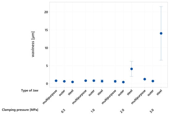 No significant differences in shape character were observed at the lowest clamping pressure. However, a notable difference was observed when the clamping pressure was increased to 2 MPa, resulting in an average circular waviness value of 4.12 µm. At the maximum examined clamping pressure of 3 MPa, the average circular waviness reached 14.06 µm. The circular waviness value for the unloaded reference specimen was 0.723 ± 0.006 µm, which corresponds to the equivalent circular waviness of specimens clamped by external composite jaws, where an average value of 0.738 µm was recorded. The precision of the influence of individual parameters on the resulting circular waviness was 82.35%, and their magnitude of influence was consistent with the effect on the roundness of the examined specimens.