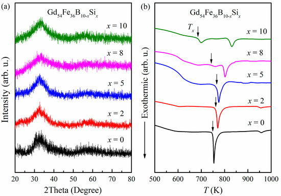 (a) XRD patterns and (b) DSC curves of the Gd54Fe36B10−xSix as-spun ribbons.