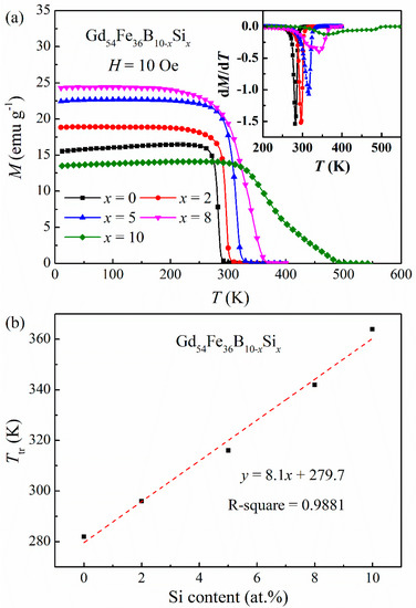 Figure 2a shows the M-T curves of the Gd54Fe36B10−xSix amorphous ribbons measured under the applied field of 10 Oe. It can be seen that the magnetization reduced with rising temperature, presenting a ferrimagnetic–paramagnetic transition. The magnetic transition temperature Ttr was determined by the inflection-point method, taking the temperature corresponding to the minimum derivative of M-T curve (namely the dM/dT vs. T plot, displayed in the inset of Figure 2a). For the samples with x = 0, 2, 5, 8 and 10, the Ttr is 282, 296, 316, 342 and 364 K, respectively. As illustrated in Figure 2b, the Ttr increased nearly linearly with increasing Si content for the Gd54Fe36B10−xSix amorphous alloys, with the fitting expression of Ttr = 8.1x + 279.7, which is possibly due to the increase in magnetic exchange coupling [19,29,30]. Although only the concentration of non-magnetic B or Si elements changed, it may affect the magnetic moment and exchange interaction in the materials [25]. Similar results have been reported in amorphous alloys Gd65Fe10Co10Al10X5 (X = B, Si) and (Gd0.6Co0.2Fe0.2)95BxSi5−x (x = 0, 2, 5) [26,31].