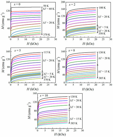As indicated by Equation (1), the magnetic entropy change is approximately proportional to the dM/dT, and thereby the M-H isotherms of Gd54Fe36B10−xSix (x = 0, 2, 5, 8, 10) amorphous alloys at different temperatures near their individual Ttr were measured under a magnetic field changing from 0 to 20 kOe, as exhibited in Figure 3. The sweeping rate of the field was slow enough to ensure that the data were recorded in an isothermal process. The obvious magnetic transition process near the Ttr could be observed in all the samples except Gd54Fe36Si10, which had not achieved a paramagnetic state at 385 K.