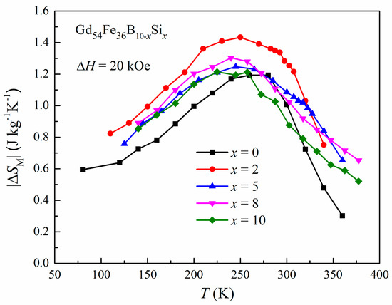 Temperature dependence of the |ΔSM| for Gd54Fe36B10−xSix amorphous alloys under the magnetic field change of 20 kOe.