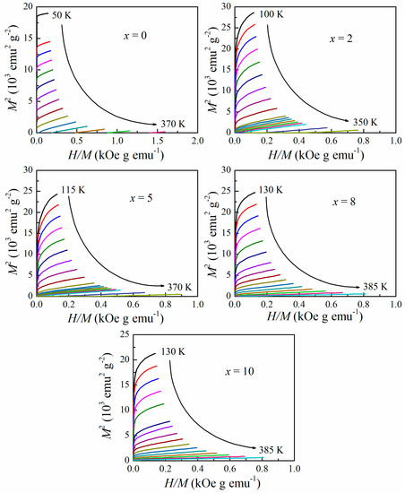 The magnetic entropy change as a function of temperature (|ΔSM| vs. T curves) is displayed in Figure 4. The maximum magnetic entropy change (|ΔSMpk|) of Gd54Fe36B10−xSix amorphous alloys under field change of 20 kOe is 1.20, 1.43, 1.25, 1.30 and 1.21 J kg−1K−1 at 260, 250, 245, 240 and 225 K for x = 0, 2, 5, 8 and 10, respectively, which increases firstly and then decreases with increasing content of Si, showing a nonlinear correlation. Gd54Fe36B8Si2 possesses the highest |ΔSMpk|. In our previous study, a similar phenomenon was observed in the (Gd0.6Co0.2Fe0.2)95BxSi5−x (x = 0, 2, 5) series of amorphous alloys [26]. The relative cooling power (RCP) is another parameter for estimating the MCE and energy efficiency of a magnetic refrigerant, and it can be evaluated by the product , where the ΔTFWHM is the full width at half maximum of the entropy curve [32]. In this work, the values of RCP for the amorphous Gd54Fe36B10−xSix with x = 0, 2, 5, 8 and 10 are 295, 374, 323, 362 and 321 J kg−1 (under the field change of 0–20 kOe), respectively. Owing to the larger value of |ΔSMpk|, the Gd54Fe36B8Si2 shows the highest RCP. Compared with the magnetocaloric properties (including |ΔSMpk| and RCP) of some other materials (with similar working temperature) listed in Table 1, the RCP values of the presently studied materials are higher in spite of their lower |ΔSMpk|, which results from the broadened entropy curve and larger ΔTFWHM. This is the typical characteristic of MCE obtained in Gd-based amorphous alloys with the second-order magnetic transition (SOMT) [18,19,29,30,33,34]. The Arrott plots (M2 vs. H/M) of Gd54Fe36B10−xSix ribbons were derived from the M-H isotherms, as shown in Figure 5. According to Banerjee criteria [35], the slopes of the Arrott plots are positive in the whole temperature range for all the samples, indicating that their magnetic transition is SOMT.