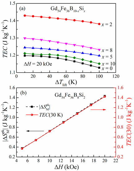 (a) TEC as a function of ΔTlift for the Gd54Fe36B10−xSix amorphous alloys, under the field change of 0–20 kOe. (b) Magnetic field dependence of the TEC(30 K) and |ΔSMpk| for amorphous Gd54Fe36B8Si2.