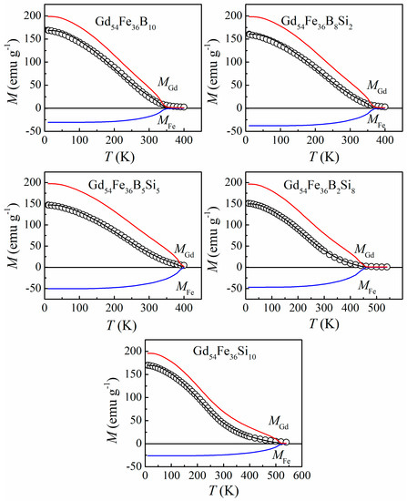M-T curves for the Gd54Fe36B10−xSix (x = 0, 2, 5, 8, 10) amorphous alloys under magnetic field of 6 kOe (open circles) and the fitting results (solid line). Calculated data of two sublattice magnetizations (MGd and MFe are denoted as “red line” and “blue line”, respectively) are also shown.