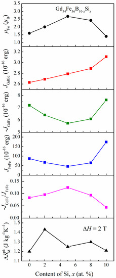 In Figure 8, the variation tendency of −JGdFe/JFeFe and |ΔSMpk| with Si content is similar, except for the Gd54Fe36B5Si5; the atomic-scale structure and accurate μFe of this series of alloys need to be clarified further. Nevertheless, it can be revealed that the appropriate substitution of Si for B promotes the value of |ΔSMpk| and table-like MCE of amorphous Gd54Fe36B10−xSix alloys; this can be attributed to the enhancement of the −JGdFe/JFeFe and modified magnetic transition behavior. An excessive amount of Si results in a decline in the −JGdFe/JFeFe, an inflection-like transition and the deterioration of magnetocaloric properties.