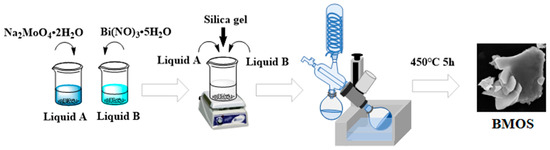 BMSO was prepared via an in situ synthesis method (Figure 1). As per usual, 1 mmol Na2MoO4·2H2O was dissolved in 15 mL HNO3 (1 mol/L) aqueous solution, named A. A certain amount of Bi(NO3)3·5H2O has dissolved in 10 mL HNO3 (1 mol/L) water solution, named B. A and B were sonicated for 0.5 h, then stirred continuously for 2 h. Then, A and B were mixed, and silica gel (LUDOX HS-40) was added to the solution. The solution was dried with a rotary evaporator at 90 °C to collect the precipitation. Then, the above precipitation was transferred to the Muffle furnace and calcined at 450 °C for 5 h [12]. After waiting for the resulting product to cool naturally, it was washed with ethanol and ultrapure water and centrifuged. Lastly, BMOS was obtained after drying at 60 °C for 12 h. The mixtures that were collected were called BMOS-x, where x denotes the molar ratio of Mo: Si (1:1, 2:1, 3:1, and 4:1). Bi2MoO6 (BMO) was prepared via the above method without adding a silicon source. The synthesis methods of Bi2SiO5 (BSO) are presented in Supplementary Materials Text S2.