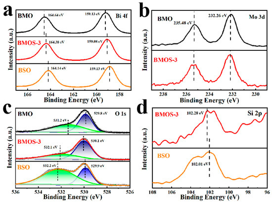 XPS spectra of BMO, BSO, and BMOS-3: high resolution of (a) Bi 4f, (b) Mo 3d, (c) O 1s, and (d) Si 2p.