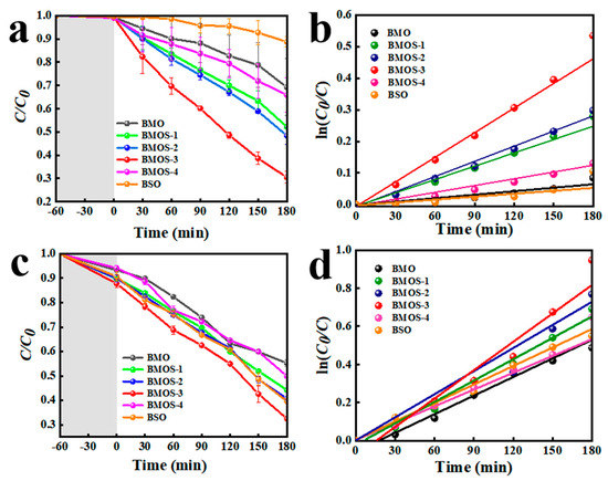 We synthesized several BMOS-x heterojunction photocatalysts and also investigated their activities in RhB (Figure 6a,b) and TC (Figure 6c,d) photodegradation by using a 500 W Xe lamp as the optical source [28]. Compared with BMO and BSO, the degradation capacity of RhB by BMOS-3 was 7.5 times higher than that of BSO and 3.75 times higher than that of BMO. The degradation capacity of TC by BMOS-3 was 1.58 times that of BMO and 1.42 times that of BSO. As illustrated, the degree of photodegradation relies on the BSO content, and we identified BMOS-3 as the most effective composite (75% RhB and 62% TC in 180 min). To further explore its photocatalytic activity, the degradation kinetics of the BMOS-x catalysts were modeled by a pseudo-first-order model (Figure 6b,d). Figure S4 gives the photocatalytic degradation rates of RhB (TC) under visible light on the BMO, BSO, and BMOS-x. BMOS-3 showed the optimal photocatalytic degradation rate. In the BMOS-3/light system, 45.3% (RhB) and 34.4% (TC) of the total organic carbon (TOC) can be eliminated. In addition, the BMOS-3 heterojunction also showed better photocatalytic activity for the photodegradation of RhB compared with some previous reports (Table S1).