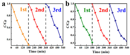 Cyclic operation of photocatalytic degradation of (a) RhB and (b) TC in the existence of BMOS-3.
