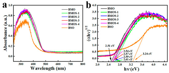 As shown in Figure 8a,b, the optical absorption properties and band gaps of the as-prepared heterojunctions were investigated via UV-VIS spectroscopy. As shown in Figure 8a, with the increase in the BSO component content, the absorption edges that occurred slightly blue-shifted, and the absorbance gradually became stronger, suggesting that more visible light energy can be absorbed due to the successful formation of heterojunctions. The band gap energies (Eg) were computed with the Tauc plots [9]. In Figure 8b, the band gap energies of BMO and BSO were 2.51 and 3.24 eV, respectively.
