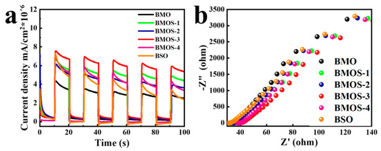 (a) Transient photocurrent responses and (b) EIS plots of BMO, BSO, and BMOS-x.
