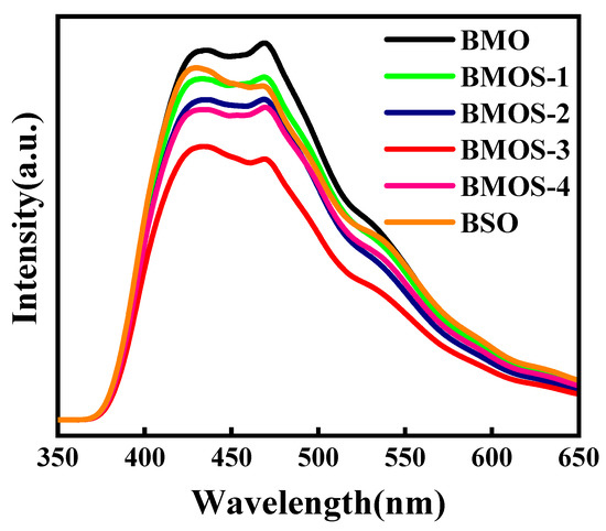 The separation rate of the photogenerated electrons and holes was subsequently evaluated via PL emission intensity [32]. As shown in Figure 10, the PL emission intensity of BMOS-x was obviously lower than those of the BMO and BSO samples, indicating that the conjunction formation improved electron–hole separation efficiency.
