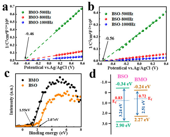 The distances from the Fermi level to the valence band can be obtained from the VB-XPS spectra (Figure 11c). The Fermi levels of BMO and BSO can be further computed as 0.72 eV and 0.83 eV, respectively [33]. As shown in Figure 11d, the energy level structure of the compounds can be drawn according to the above calculated values.