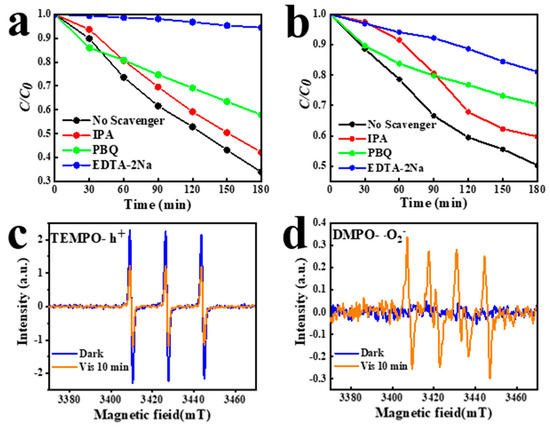 IPA, EDTA-2Na, and PBQ were used as scavengers of •OH, and •, respectively, in trapping experiments to determine the active species in the photodegradation of RhB and TC [34]. As shown in Figure 12, the RhB and TC degradation rates decreased to 60% and 40%, respectively, after IPA addition. When using PBQ as sacrificial agents of •, the reactivity was further hindered, and the degradation capacity was further reduced to 40% and 30%, respectively. The photodegradation efficiency of RhB and TC decreased significantly with the addition of EDTA-2Na.