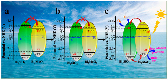 According to the above experimental results and data analysis, a possible mechanism for the photocatalytic degradation of RhB and TC by BMOS-3 was proposed. As shown in Figure 13a, it can be found that the conduction band of BSO is more negative than that of BMO. This implies that electrons may transfer from BSO to BMO. The conduction band position of BMO was observed to be −0.24 eV, while the • potential (O2/•) was −0.33 eV. It is not sufficient to generate the • active species. Furthermore, the Fermi level of BMO is higher than that of BSO, which is contrary to the electron flow. Therefore, the inference in Figure 13a is not reasonable. As shown in Figure 13b, electron transfer from BMO to BSO is not possible because the conduction band of BSO is more negative than that of BMO. Then, we hypothesize the existence of high-energy electron orbitals in BMO, as reported previously [36]. Photogenerated electrons transferred from the high-energy electron orbitals to the conduction band of BSO. The electrons combine with O2 to form •. Meanwhile, As shown in Figure 13c, transferred from the valence band of BSO to the valence band of BMO and participated in the oxidative degradation of RhB and TC. Thus, successfully establishing BMOS-x can prevent electron–hole complexation, promote photogenerated carrier transfer, and improve photocatalytic activity.