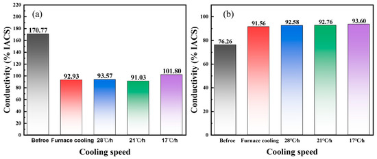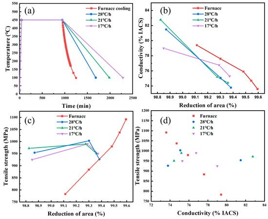 Figure 1a shows the aging treatment curves for the Cu-6 wt% Ag alloys. The samples were all aged at a constant temperature of 450 °C for 15 h with different cooling rates in the furnace, which were furnace cooling, 28 °C/h, 21 °C/h, and 17 °C/h. The variation of conductivity with deformation for the Cu-Ag alloy sheets under different cooling rates showed a similar trend, that is, a continuous decrease as the deformation increased, as shown in Figure 1b. The rolling was performed on the two-high mill with a diameter of the roll of 80 mm, a rotational velocity of the roll of 0.2 r/s, and a reduction per press of about 0.1~0.2%. A larger deformation can lead to more defects, which will cause a greater scattering of electrons. At the same deformation, the Cu-Ag alloy cooled in the furnace showed higher conductivity.