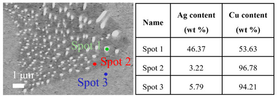 Figure 3 shows the EDS results of Cu-6 wt%Ag alloy aged at 450 °C for 15 h with the 17 °C/h cooling rate. Spot 1 is the Ag-rich phase, showing that the Ag content is 46.37%. Spot 2 is the Cu matrix portion of the discontinuous precipitation phase. Spot 3 is the area of nanoscale Ag precipitates with an Ag content of 5.79%. This discontinuous precipitation phase structure reduces the interfacial density of the Cu and Ag phases and contributes to improved electrical conductivity.