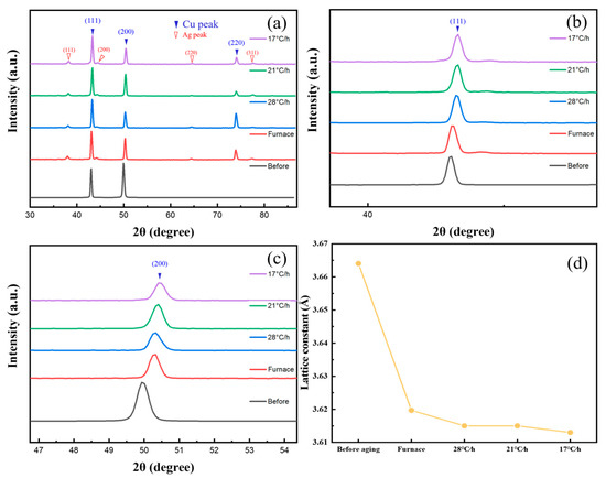 (a) XRD profiles of Cu-6 wt%Ag alloys before and after age treatment. (b) Local magnification of Cu (111) diffraction peak. (c) Local magnification of Cu (200) diffraction peak. (d) Lattice constants of Cu-6 wt%Ag alloy at different age cooling rates.