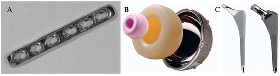 (A) Titanium alloy plate for internal fixation of fracture. (B) Pink spherical structure is ceramic head for total hip arthroplasty. (C) Various type of titanium alloy stem for total hip arthroplasty [2,3].