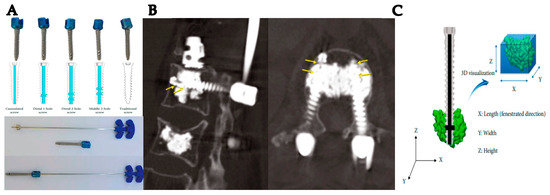 (A) Cement screw design and cement injector in the Iliad™ pedicle screw system. (B) The guide arrow indicate the side hole of fenestrated screw in clinical computed tomography. (C) Three-dimensional analyses of cement distribution [73].