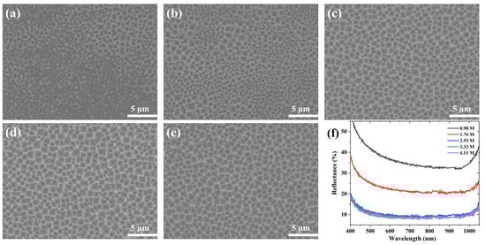 SEM images of Si surface etched in different H2O2 solutions for 7 min: (a) 0.98 M; (b) 1.76 M; (c) 2.55 M; (d) 3.33 M; (e) 4.11 M. (f) Reflectance spectra.