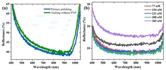 Reflectance spectra of etching systems etched for 7 min (a) without PVP and (b) with different concentrations of PVP.