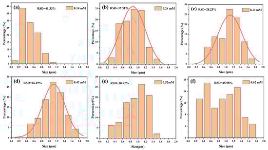 Histograms of inverted pyramid pore size distribution etched with different AgNO3 concentrations: (a) 0.14 mM; (b) 0.24 mM; (c) 0.33 mM; (d) 0.42 mM; (e) 0.52 mM; (f) 0.62 mM.