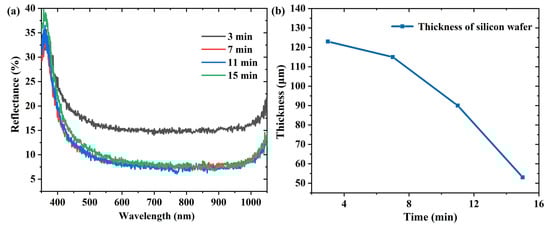 (a) Reflectance spectra and (b) thickness variation of silicon wafers etched for different times.