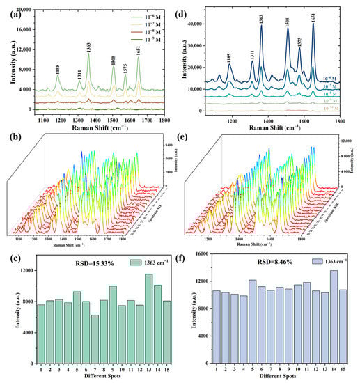 (a) The Raman spectra of various concentrations of R6G solution; (b) Raman spectra of 10−6 M R6G solution from 15 random points; (c) intensity of the characteristic peak at 1363 cm−1 from 15 random points on SERS substrates prepared by electroless deposition for 60 s; (d) the Raman spectra of various concentrations of R6G solution; (e) Raman spectra of 10−7 M R6G solution from 15 random points; (f) intensity of the characteristic peak at 1363 cm−1 from 15 random points on SERS substrates prepared by sputtering for 30 s.
