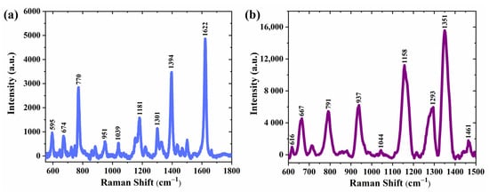 Raman spectra of (a) MB (1.0 × 10−5 M) and (b) AMX (1.0 × 10−4 M) were collected on a substrate (silver sputtering time of 30 s on Si-inverted pyramid).