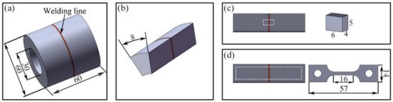 Schematics of the GH4065A IFW joint (a), PWHT sample (b), sampling location and size of the metallographic sample (c) and creep specimen (d) (unit: mm).