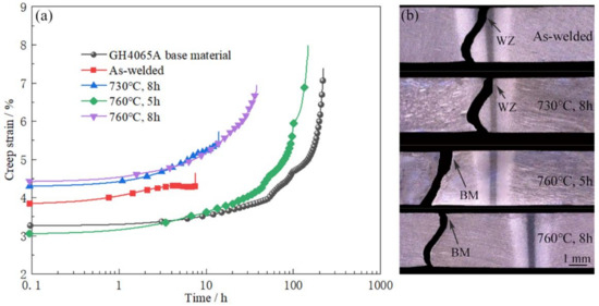 The other two sets of data in Table 4 show the same regularity. The creep tests results (Figure 6 and Table 4) indicate that the influence of aging at 730 °C on improving the creep resistance of joints is relatively small. Increasing the aging temperature to 760 °C promotes the strengthening effect of in WZ, which improves the creep resistance of the IFW joint. However, aging treatment with a longer time (8 h) at 760 °C may cause some damage to BM properties, resulting in the premature failure in BM during the creep process.