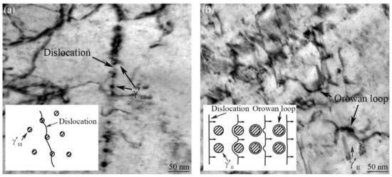 During the post-welding aging treatment, the growth of in WZ can effectively improve the high-temperature properties of the Ni-based superalloy IFW joint. For example, the tensile yield strength of the FGH96 IFW joint increased by approximately 80 MPa because the in WZ grew from 16 nm to 20 nm after aging treatment [7]. For U720Li Ni-based superalloy with 35% of , the critical resolved shear stress (CRSS) of the alloy increased with the size when the size was less than 40 nm. However, when the size of was above 40 nm, the CRSS decreased with its size [30]. Moreover, the size of affected the alloy deformation mechanism. When was small, the deformation mechanism was the shearing mechanism (dislocation shearing ), and the strengthening effect increased with the size. However, when the grew to a certain range, the deformation mechanism transformed into Orowan looping (dislocation bypassing ), and the strengthening effect decreased with its size [24].