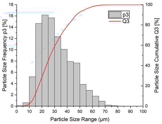 Within this work, the low-alloyed steel 30CrMoNb5-2 is investigated. The extended chemical composition of the alloy is listed in Table 1. Since the particle size distribution (PSD) is significantly impacting the absorptivity of laser radiation, the powder was characterized by a Camsizer X2 (producer: Microtrac Retsch GmbH), using high-speed imaging. The results are visualized in Figure 1, resulting in the following key parameters. The D10/50/90 values indicate that 10/50/90% of the particles have an even or smaller diameter than the presented value: