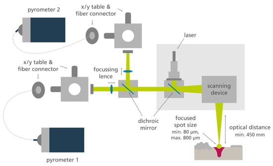All pyrometer investigations were carried out using a Midi+ L-PBF system (producer: Aconity GmbH). Argon was utilized as an inert gas, resulting in an oxygen content of max. 400 ppm. The inert gas flow was set to 1 m/s in order to remove by-products of the welding process. The machine is equipped with four single-mode laser units (wavelength 1070 nm) and corresponding optical units. The optical path of the pyrometers is coaxially coupled into one of these units. This optical unit serves merely as a measurement tool, while the actual laser radiation is guided over a separate unit. The coaxial integration of the pyrometry is shown in Figure 2.