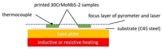 Figure 3 shows the experimental setup used to validate the temperature measured by two-color pyrometry as well as to determine the emissivity in dependency of the temperature. For temperatures up to 401 °C, a resistive heating system was used, and an inductive heating system was used for higher temperatures. The heating systems are separated by a base plate from the 2 mm thick substrate (here: C45 steel), which serves as a replaceable build platform. Two 30CrMoNb5-2 cuboid samples of 10 × 10 × 2 mm3 are printed onto the substrate plate. A K-Type thermocouple with an accuracy of ±1 °K or ±0.75% is fixed to one of the samples using an M3 stainless steel screw. The thicknesses of the substrate and samples are minimized in order to avoid a loss of temperature between the heating system and the focus layer. When setting the machine to the maximum temperature of 1200 °C (measured inside of the machine close to the heating system), the thermocouple reached a maximum of 938 °C.