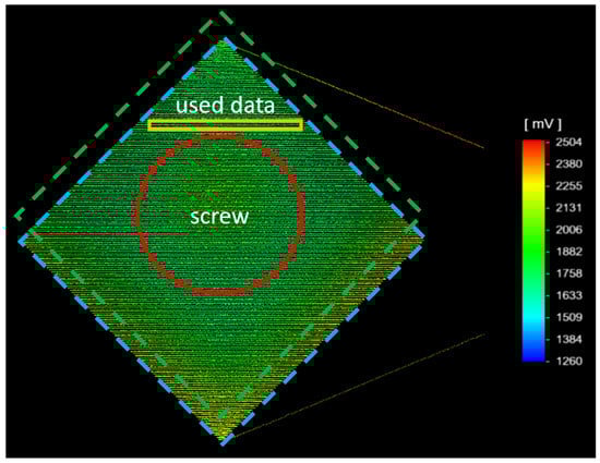 Data recorded while scanning the sample. Scanning field marked in blue. Sample marked in green. Screwhead marked in red. Relevant data used for the following analysis is marked in orange.