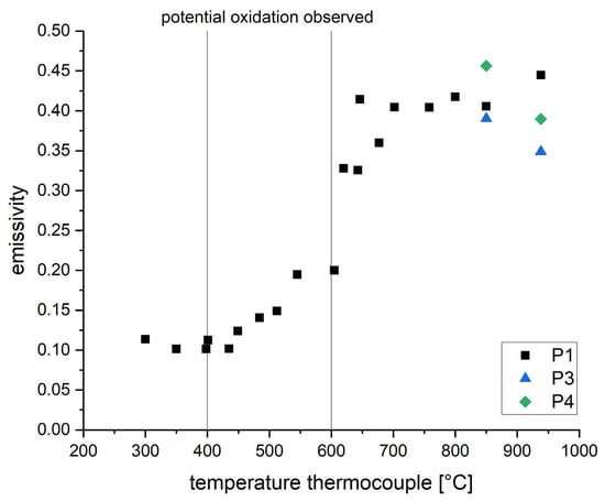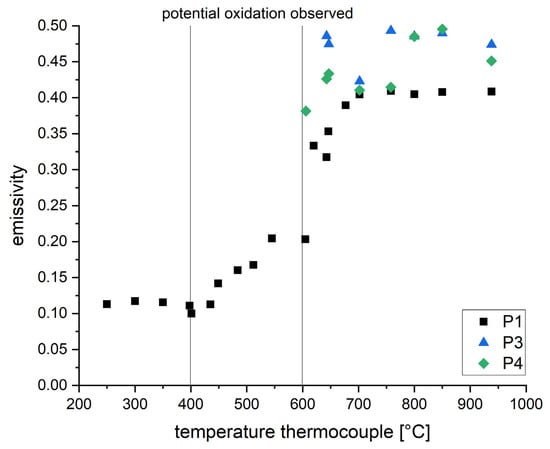 The emissivity calculated by this approach is shown in Figure 7. The results regarding P1 are in accordance with the alternative approach of linear regression. P3 and P4 show a lower deviation compared to the approach by linear regression. A pyrometer features a minimum error when adjusted to a maximum emissivity. The smaller fluctuations can therefore be associated with the assumed emissivity of 1 (see Formula (2)). In general, the approach presented by Formula (2) could also be used at lower assumed emissivity by considering the theoretical black emitter only partially. This approach has not been regarded since a lower assumed emissivity would also result in an increased error. However, due to the high setting of the emissivity, the resulting pyrometer signals are lower, resulting in the first suitable measurement signal above 850 °C.