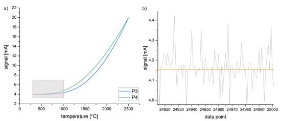 Thombansen et al. [21] describe the challenges of L-PBF processing in combination with a coaxially coupled process observation. Since optical elements such as f-theta lenses are monochromatically designed for the laser wavelength, chromatic aberrations of the thermal radiation could lead to a misinterpretation of temperature signals via pyrometry. In addition, the deviation could be caused by measurement noise in combination with the low significance within the calibration table for this temperature range. The calibration tables of P3 and P4 are visualized in Figure 6a. The curves show that temperatures up to 1000 °C result in a low signal of a maximum of ~4.3 mA (P3) or ~4.7 mA (P4). A typical signal, however, shows noise at a range of ±0.2 mA. A precise measurement is, therefore, not possible at these temperatures.