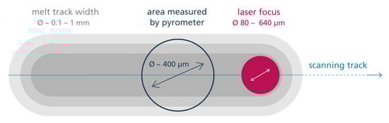 It is known that the resulting melt track can be smaller than the area measured by the pyrometer. Regarding the one-color pyrometry, this can lead to a reduced signal since the average radiation within the field is being measured. The two-color pyrometry, however, should not be affected since only the ratio of the measured intensities at different wavelengths defines the measured temperature (see Formula (5)). Therefore, the maximum temperature within the area of measurement is given by the signal. According to Book [23], this is true as long as the maximum temperature is spreading over min. 20% of the measured area.